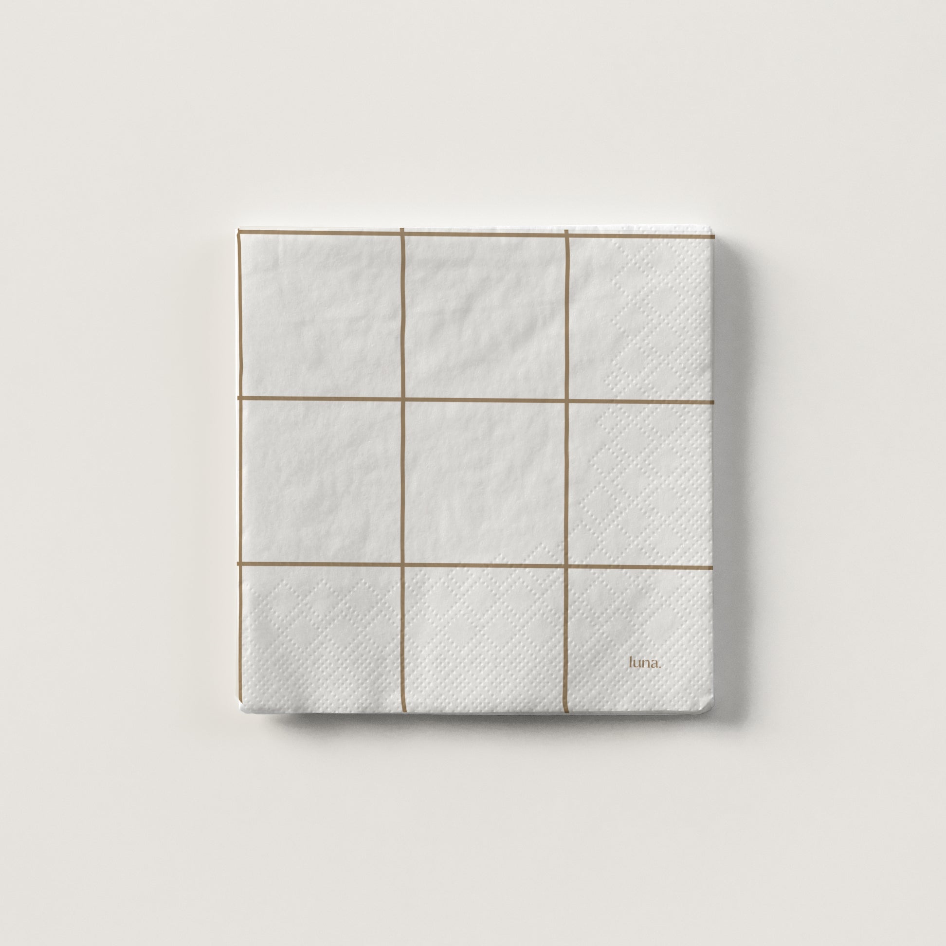 Timeless gold stripes against a crisp white background, completed with a the Luna logo.