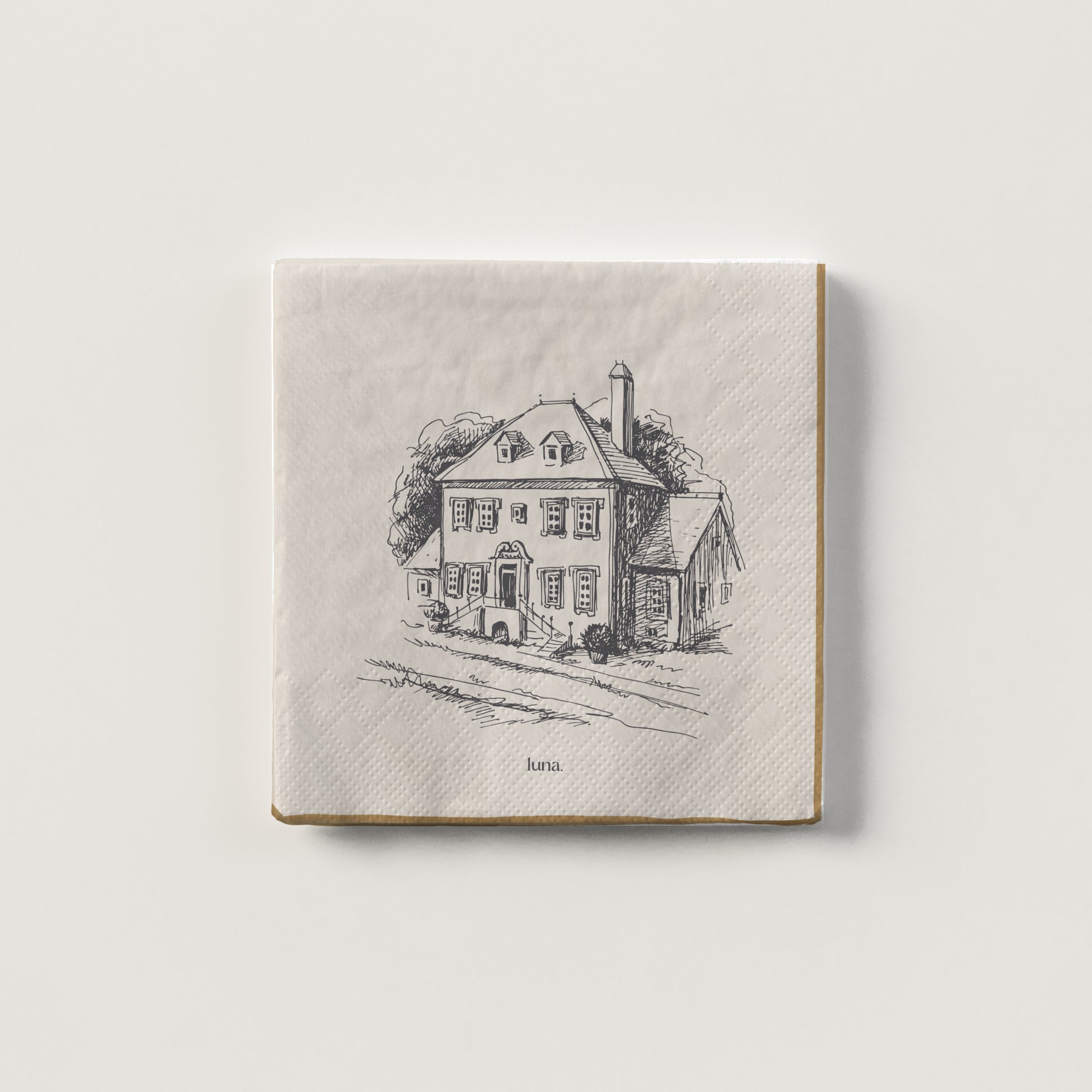 An elegant cottage nestled in the English countryside, framed by a gold border.