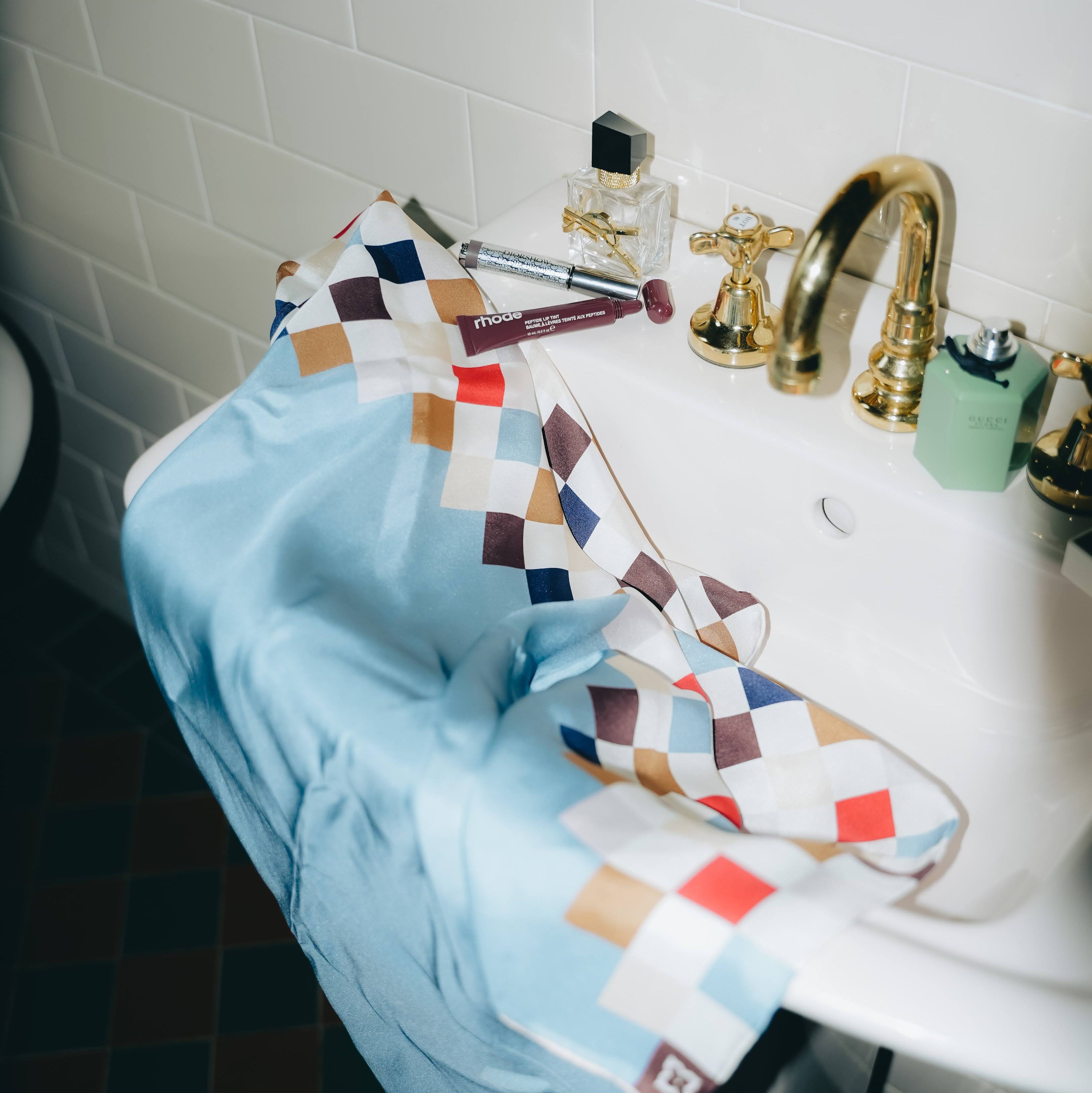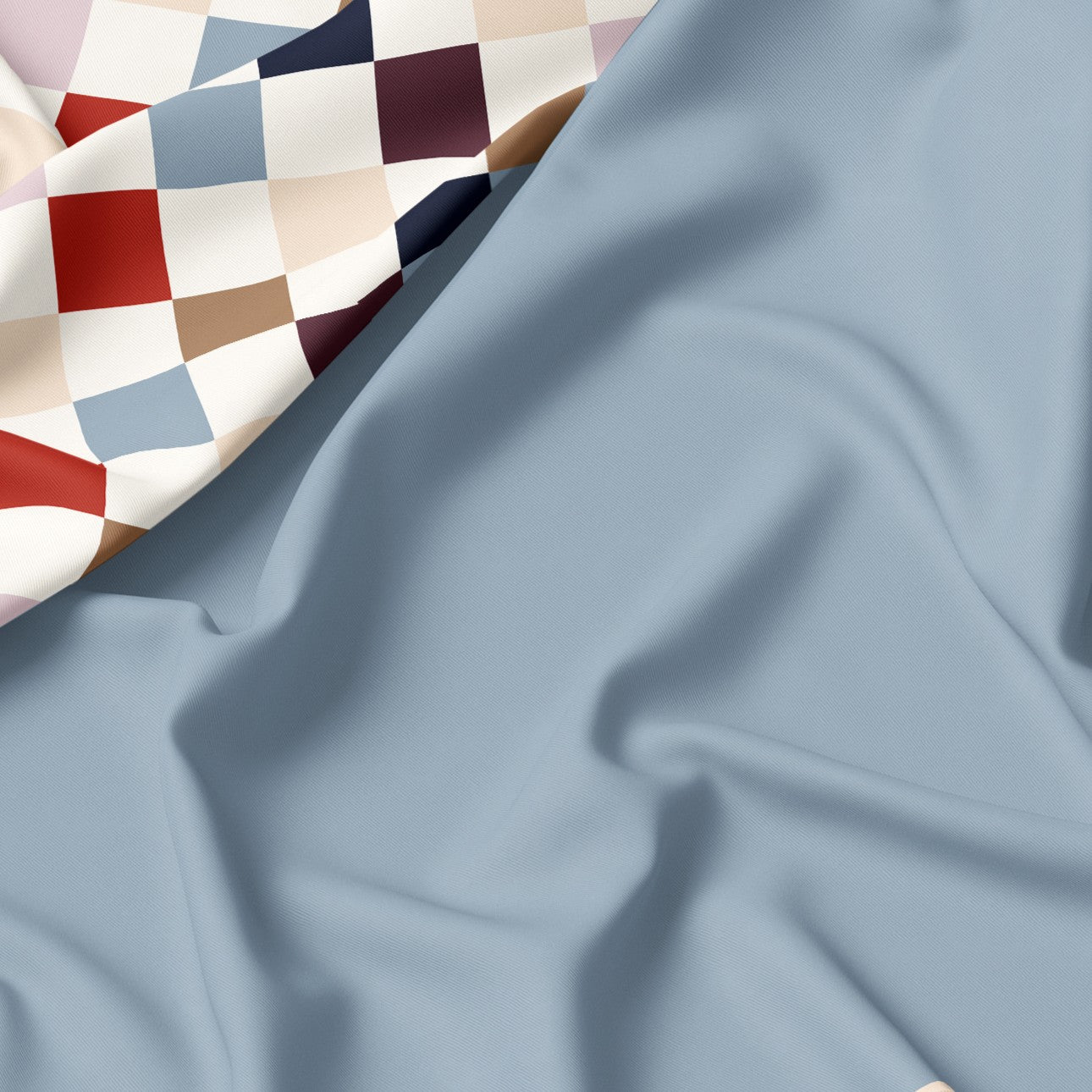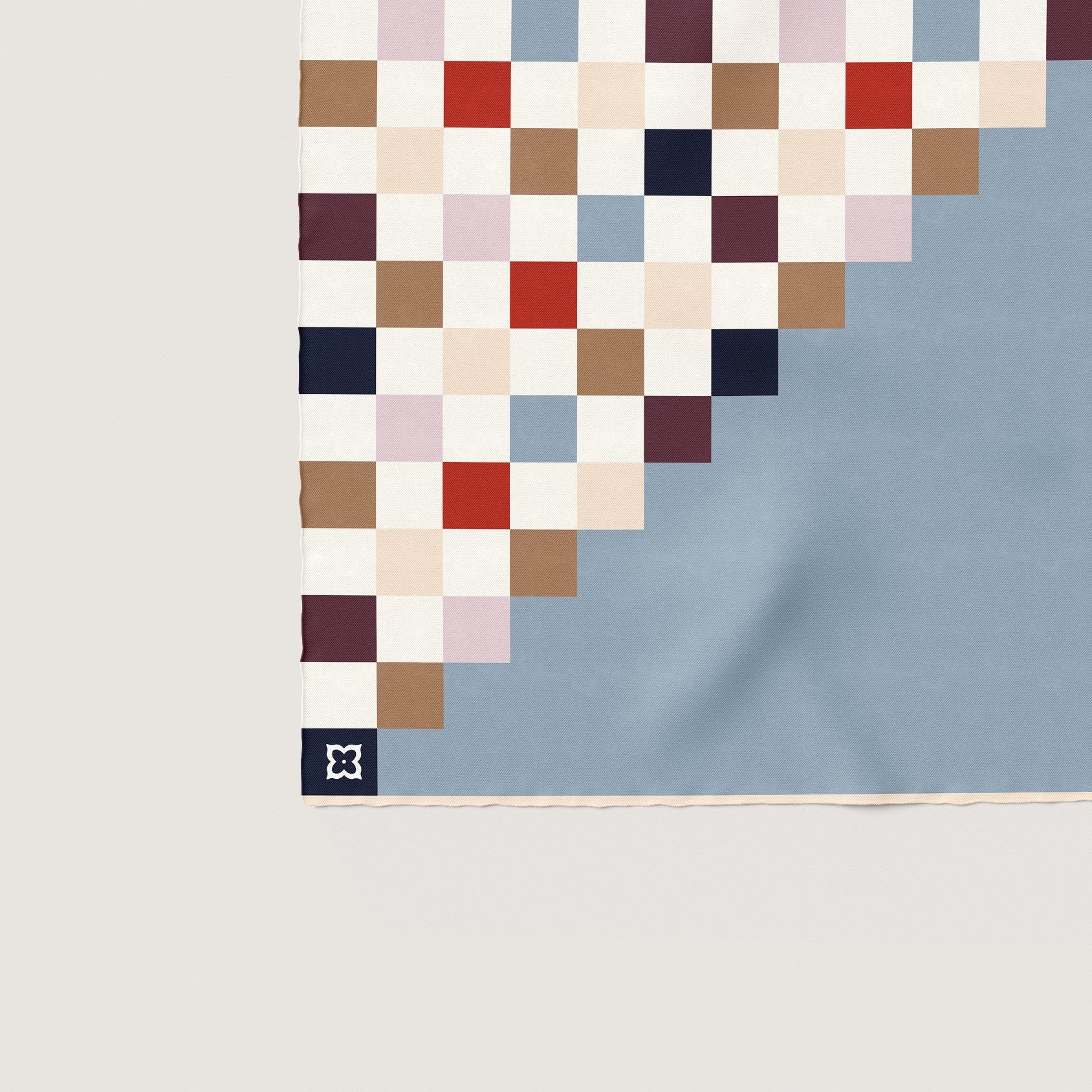 A softened checkerboard of icy jewel tones, Atelier Frost feels like a calm, winter-lit morning. Accented with a monochromatic logo and completed with a delicate cream edge to contrast the soft blue.