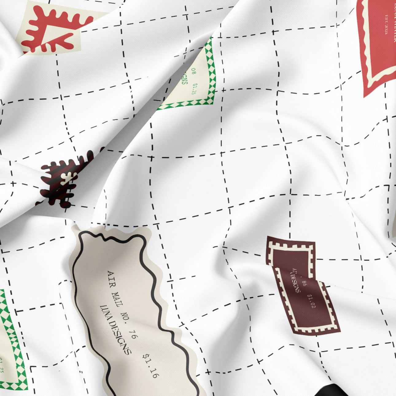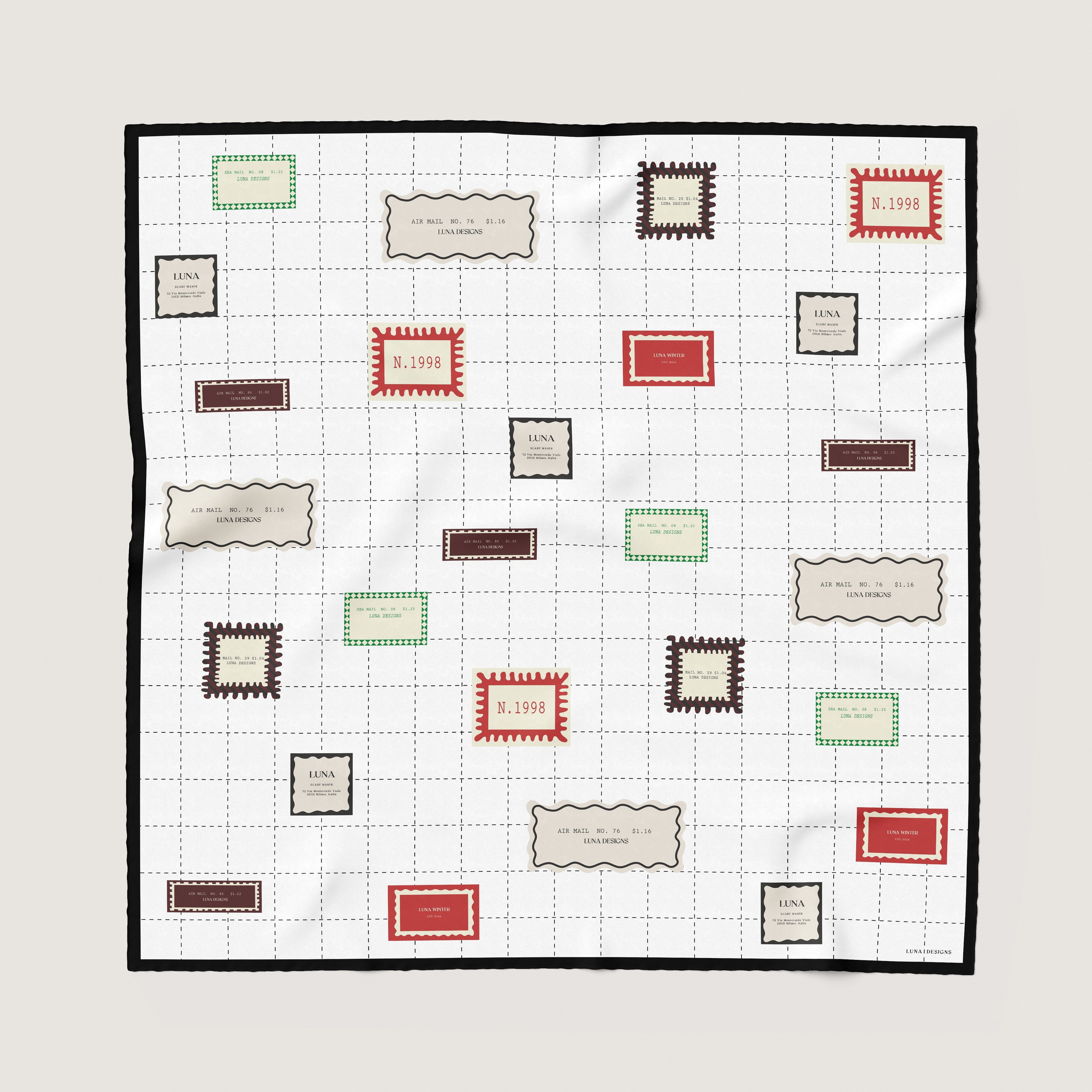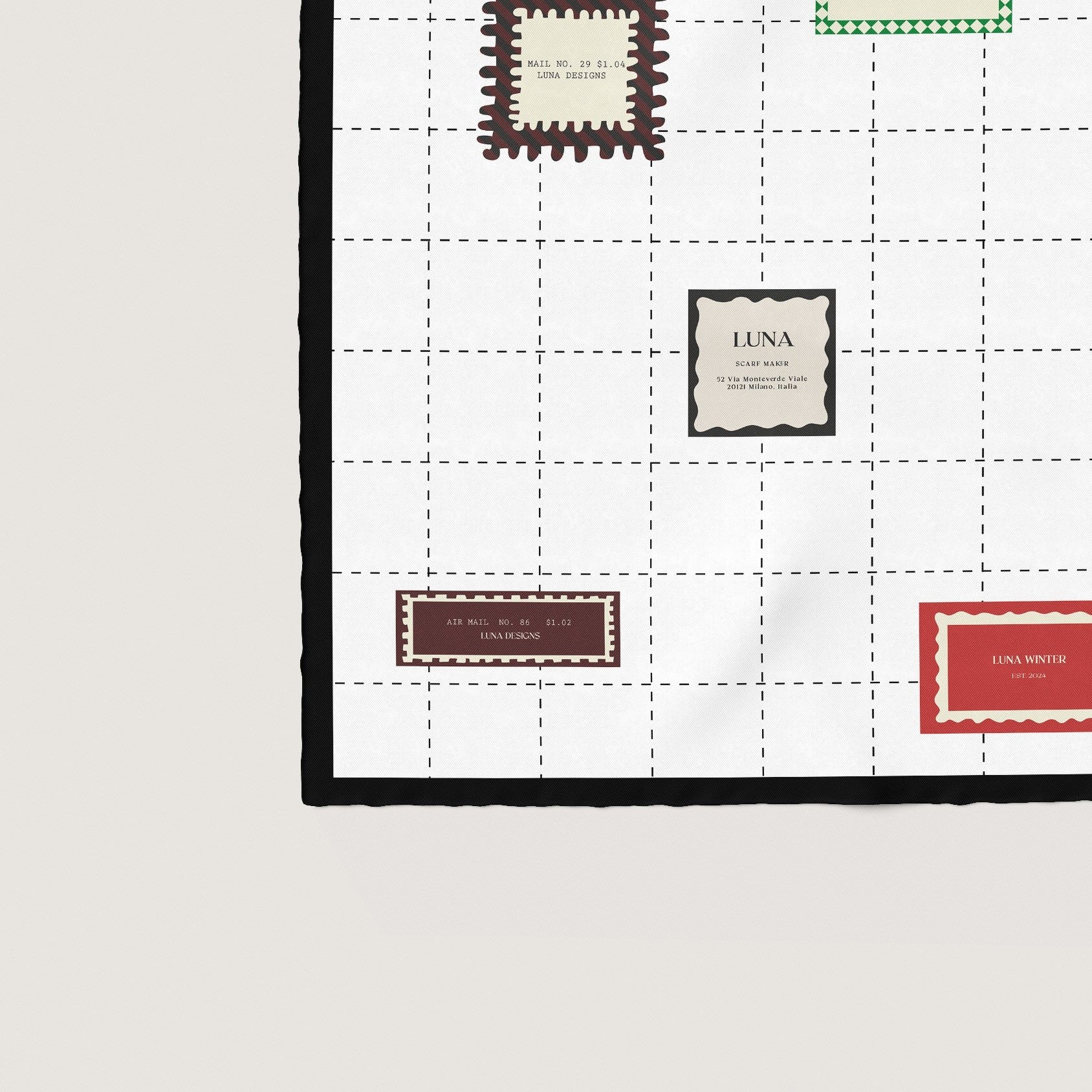 A clean ivory field is traced with a delicate dashed grid, adorned with stamp-inspired motifs in cardinal red, deep espresso, moss green, and soft parchment. The varied shapes and careful spacing evoke vintage postal details, lending the design a sense of quiet rhythm and thoughtful precision.