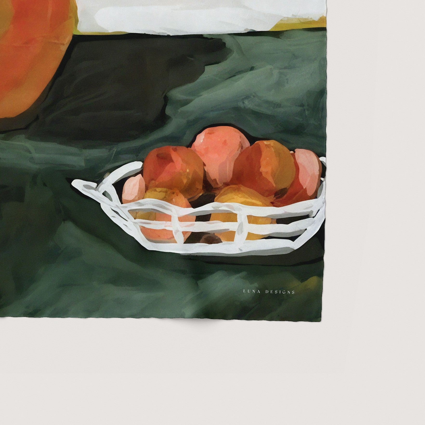 A simple moment captured in paint: an earthen vase with pale blooms, cups resting close by, and fruit gathered on the table. Warm tones and deep green ground the scene, giving it a relaxed, familiar presence.