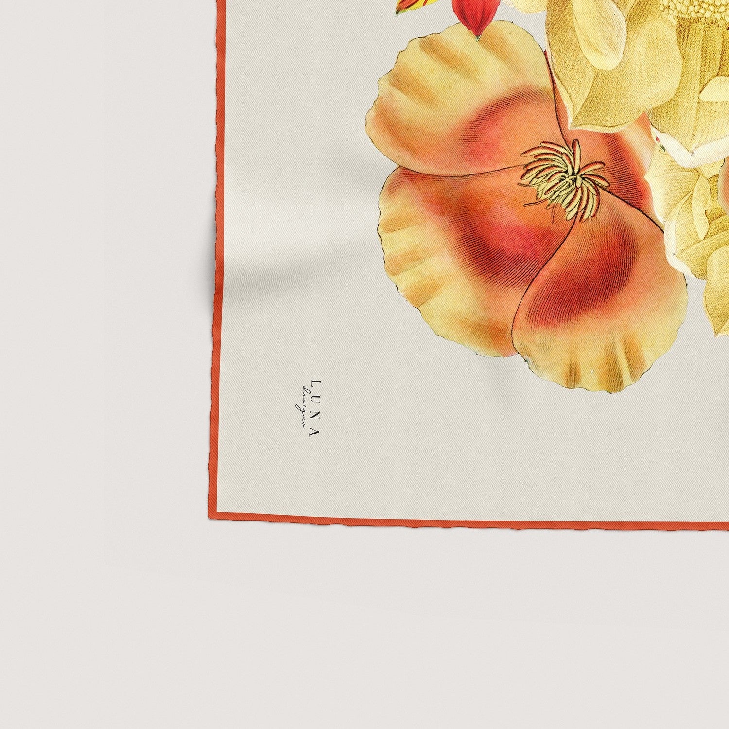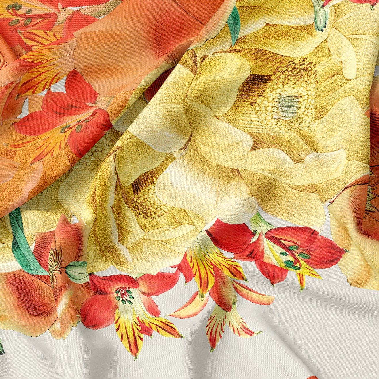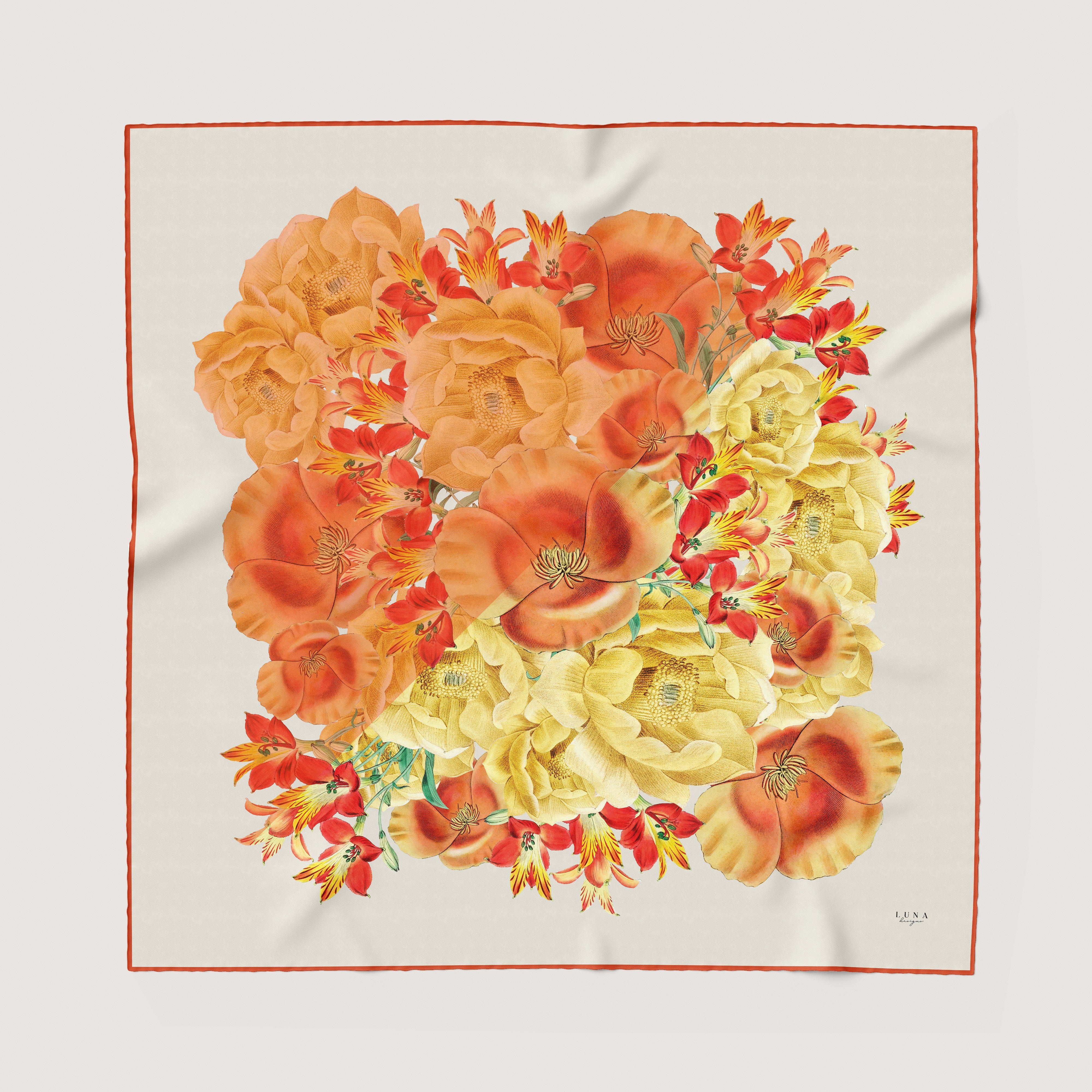 A bold celebration of color and movement - this scarf radiates the vibrancy of nature in full bloom, showcasing bursting florals in fiery orange hues.