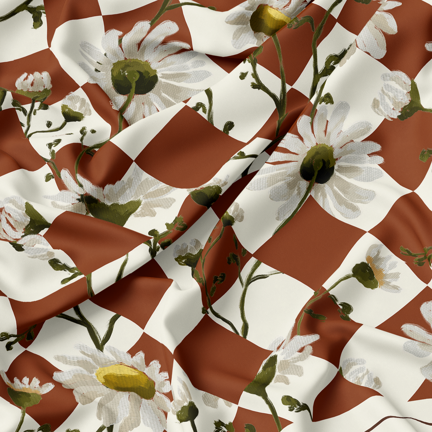 Delicate autumnal florals woven between rust red checks across a simple cream backdrop.