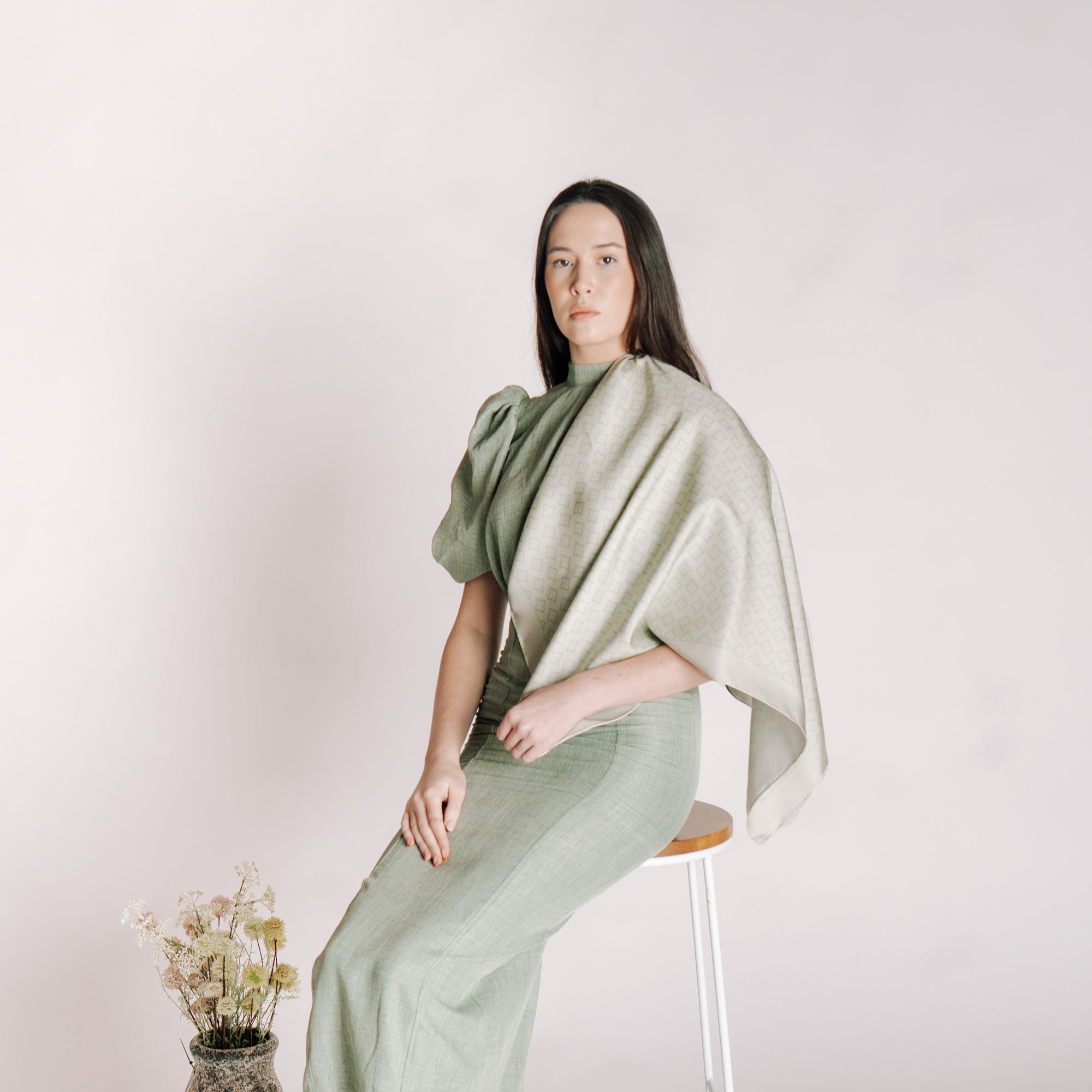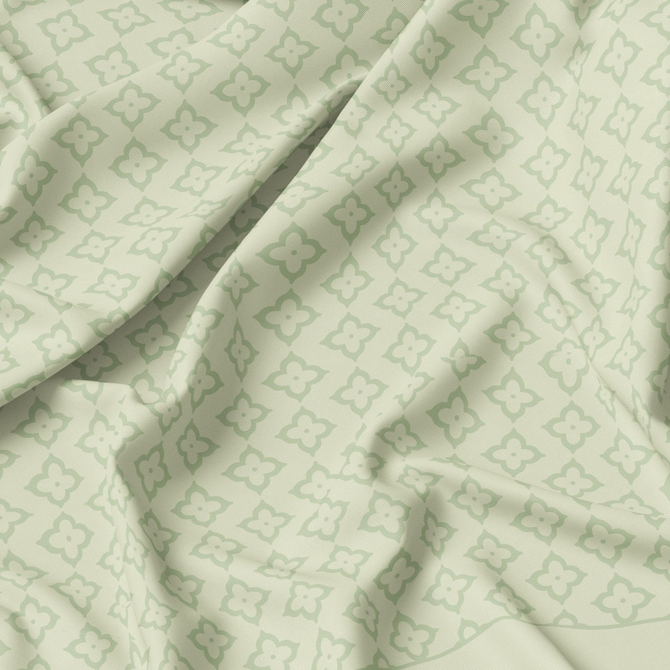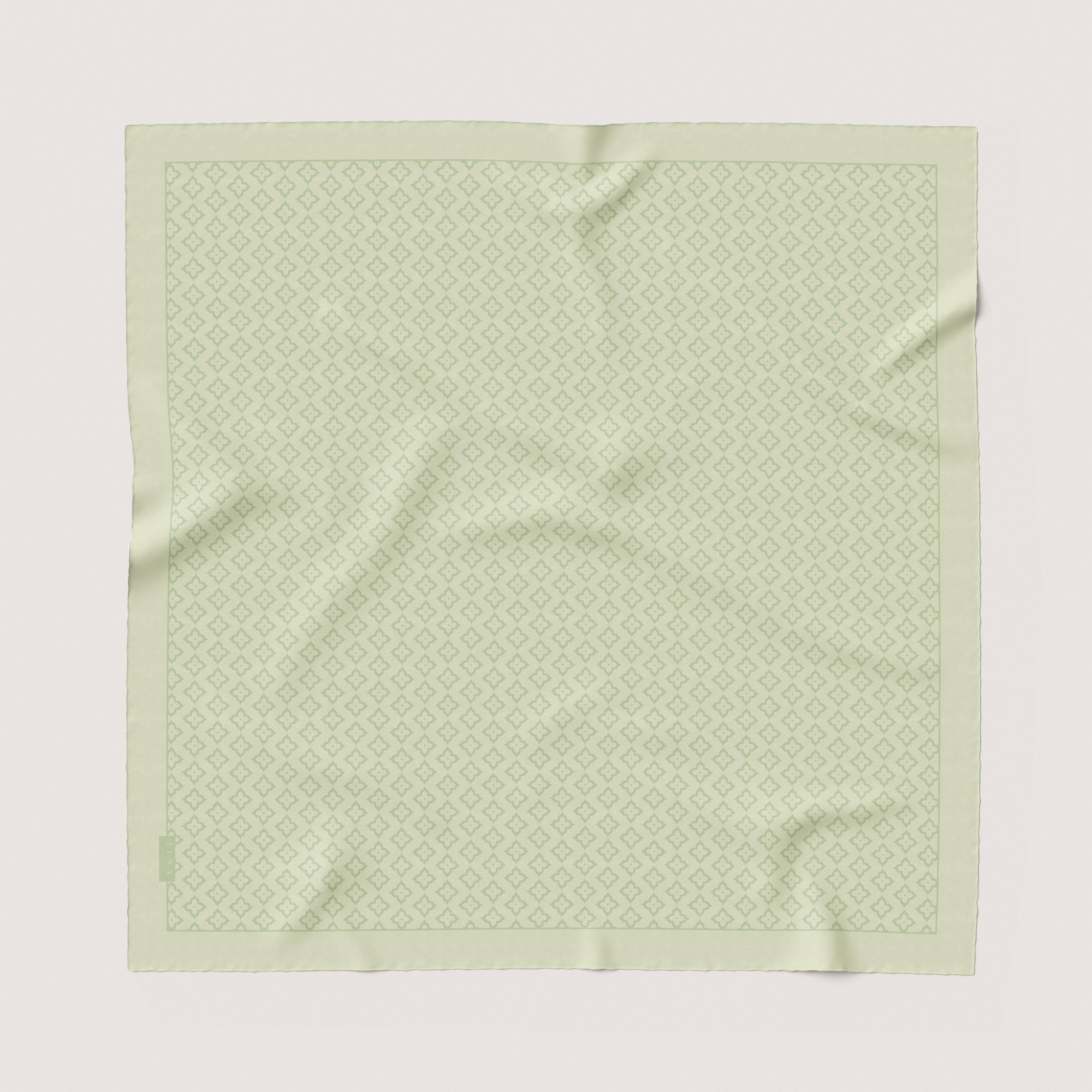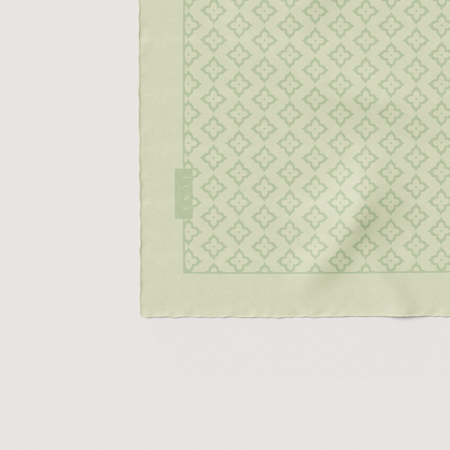 Our classic solid silk inspired by the soft greens of blossoming meadows, the pale green hue of Orinoco captures the essence of springtime serenity. Subtly adorned with our signature flower logo across the background, our classics design blends modern minimalism with timeless grace.