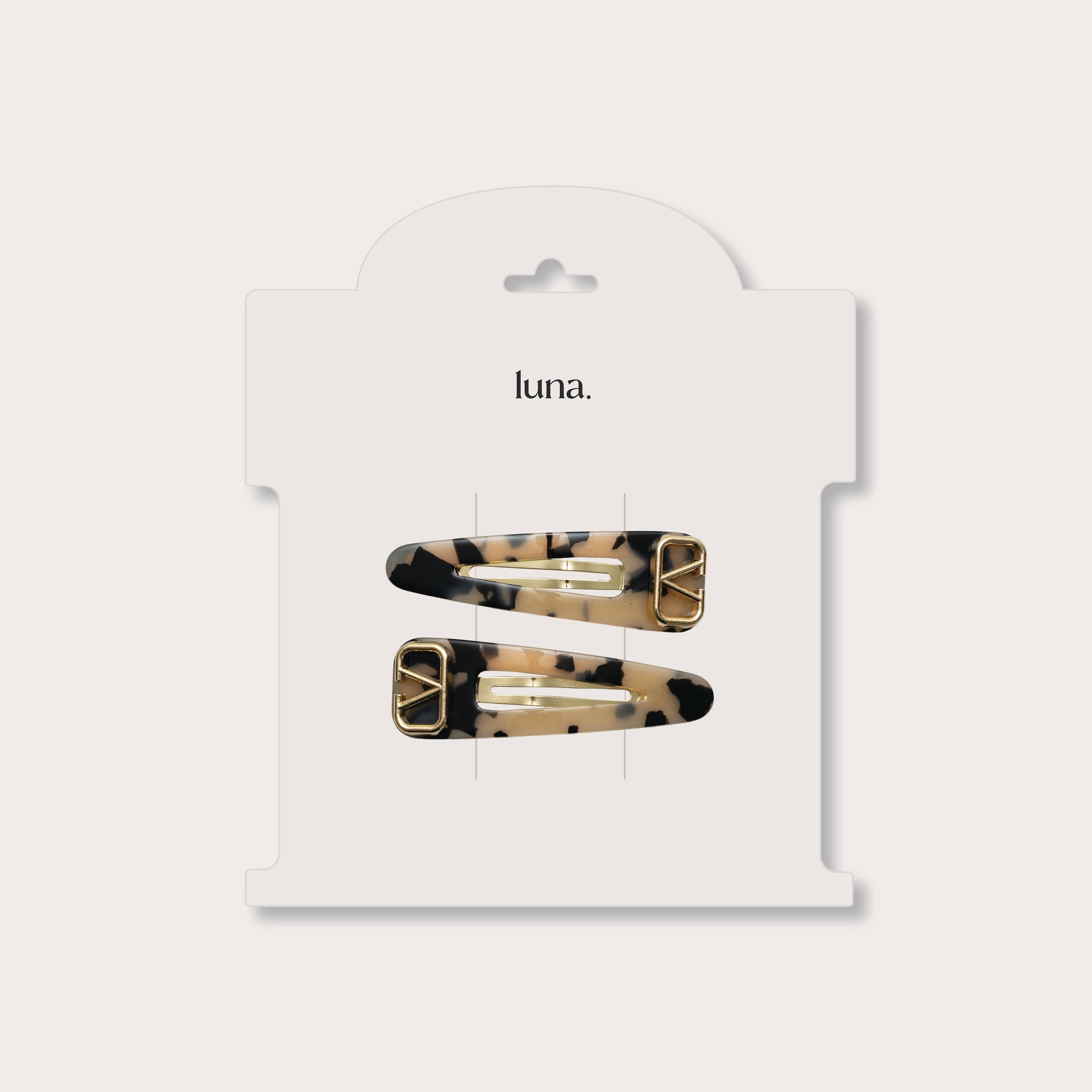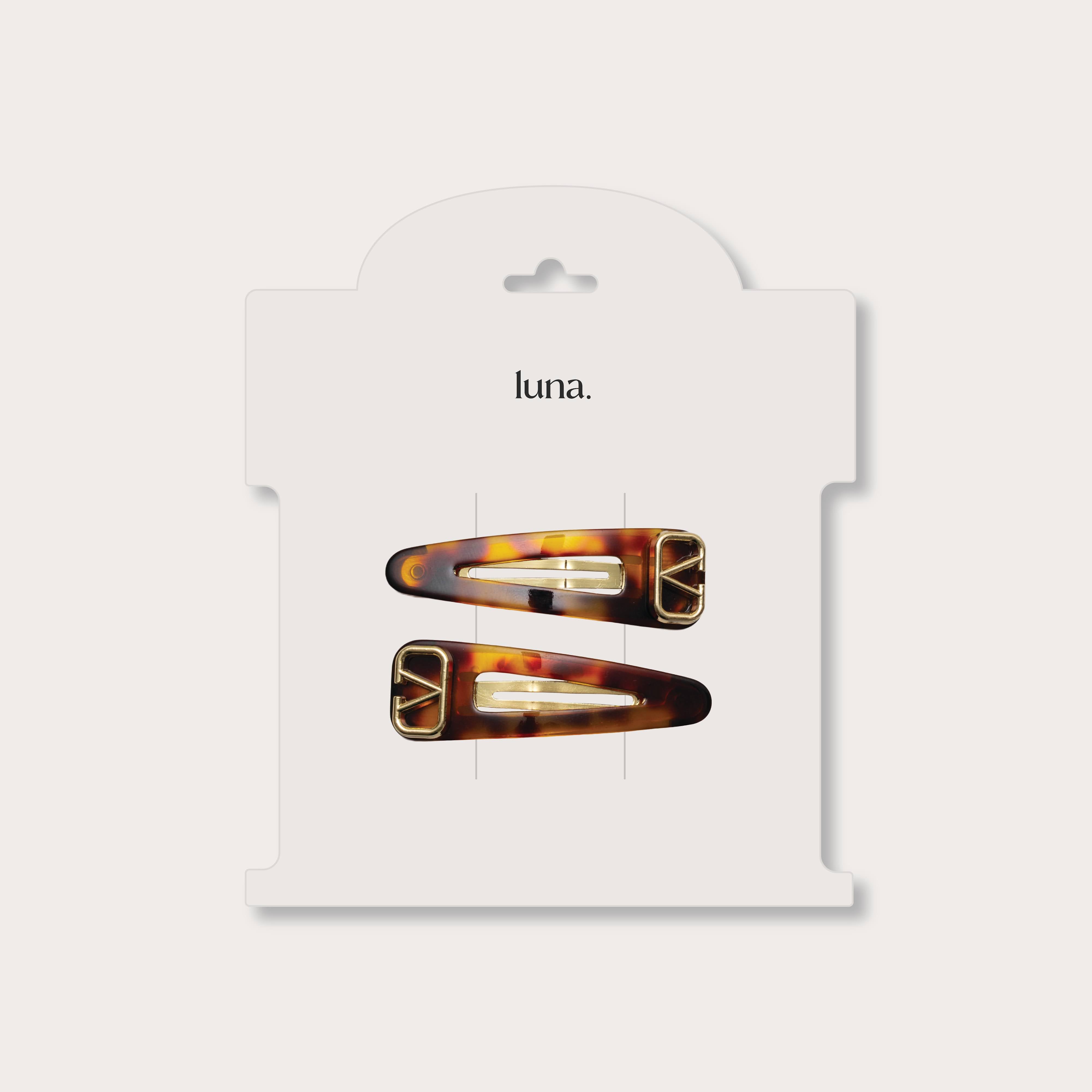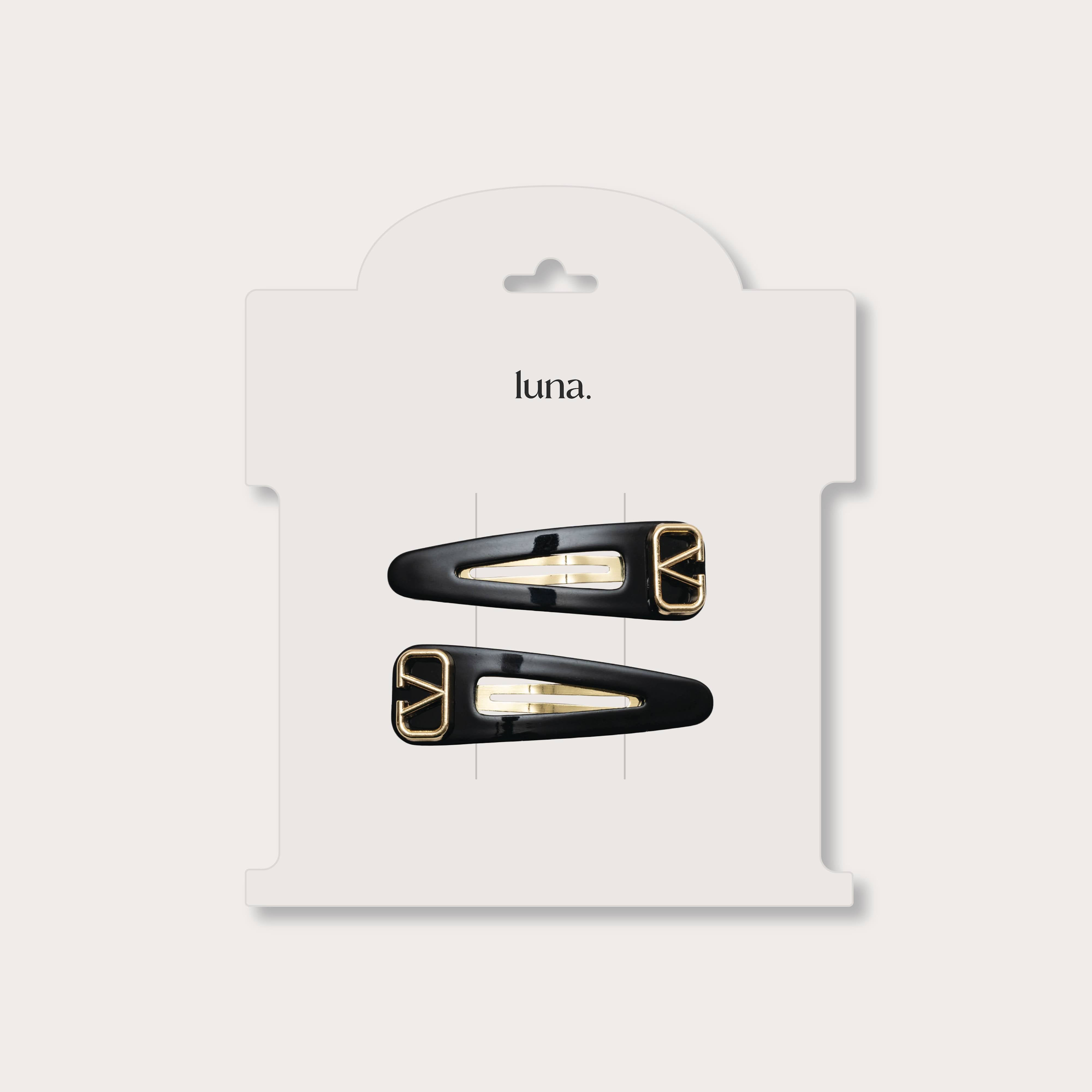 A set of elegant, high-gloss statement clips designed to secure all hair types with ease. The elongated triangular shape compliments the timeless gold logo detail.